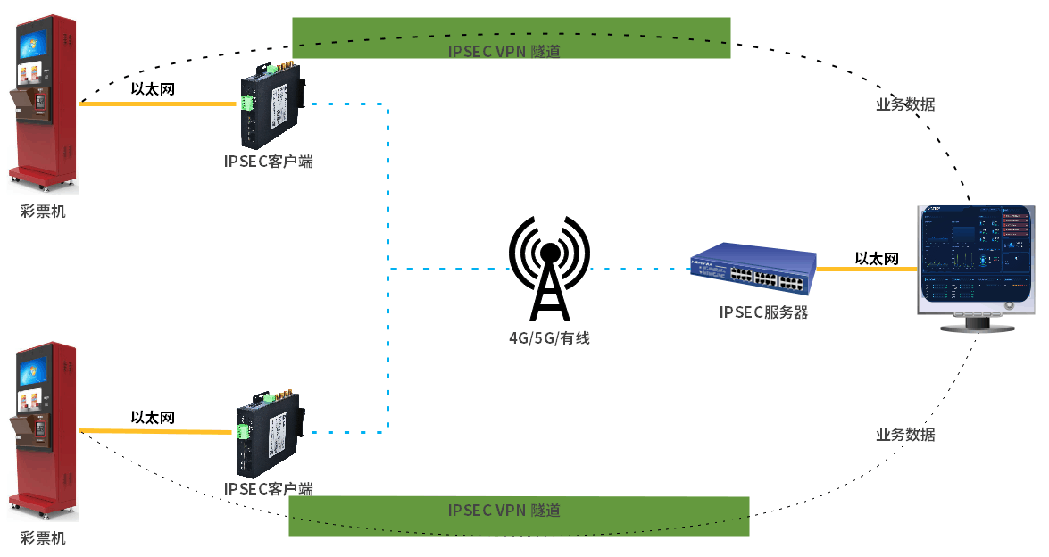 爱陆通在通过对市面上福利彩票发行中心的通信需求进行详细分析后,结合其业务特性,与多个部门进行探讨后,制定出了基于IP公众网,使用IPSec技术组建VPN网络传输方案。